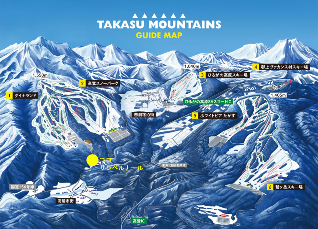 TAKASU MOUNTAINSには、ホワイトピアたかす・鷲ヶ岳スキー場・高鷲スノーパーク・ダイナランド・ひるがの高原スキー場・郡上ヴァカンス村スキー場の6か所のスキー場があり、いずれも東海北陸自動車道「高鷲IC」と「ひるがの高原スマートIC」から車でわずか20分とアクセス抜群。名古屋からは車で約2時間、大阪からでも3時間程度で訪れることができ、都市部からの宿泊客にとって大きな魅力となっています。
