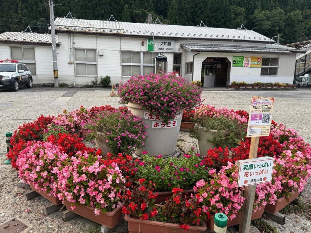 JR二ツ井駅前には周秀園で育てた花で彩られた花壇が