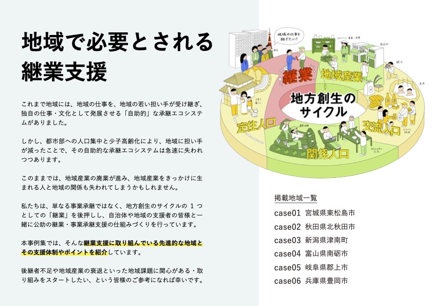 地域の機関との連携によって年々成果が出ている継業バンクですが、「実際にどのようなスキームで運用しているのか」といった、継業バンクを導入している地域の事例を知りたいという声もいただいており、この度、先進的な取り組みを進めている市町村を取り上げ「継業支援に取り組む先進地域事例集」を作成しました。