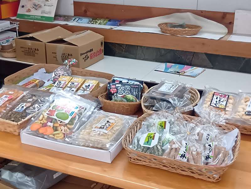 営業時間は午前10時から午後4時半頃まで。冬は積雪の多い日に休むこともありますが、基本的には毎日店を開けています。店内には山菜やなめこなどの特産品、タバコ、お菓子などの生活雑貨が並びます。