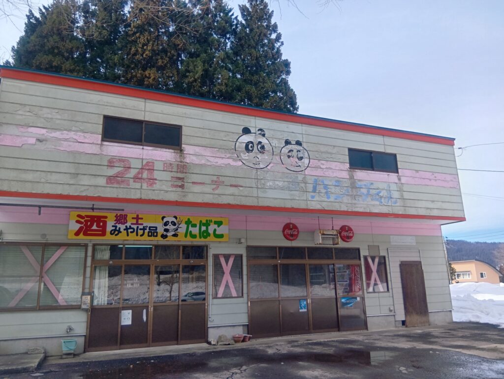 阿仁地区の国道沿いにある「阿仁またぎ総合物産」は、またたびワインや熊肉などの酒、郷土みやげ品を扱っていた店で、地元での呼び名は通称「パンダの店」。(現在は酒類小売業免許を返納しているため、お酒の販売をしていません)