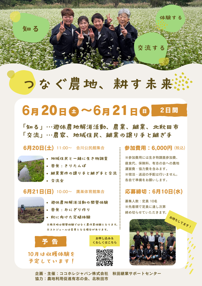 遊休農地解消の活動を「知る」、農業を「知る」、継業を「知る」、北秋田市を「知る」。
